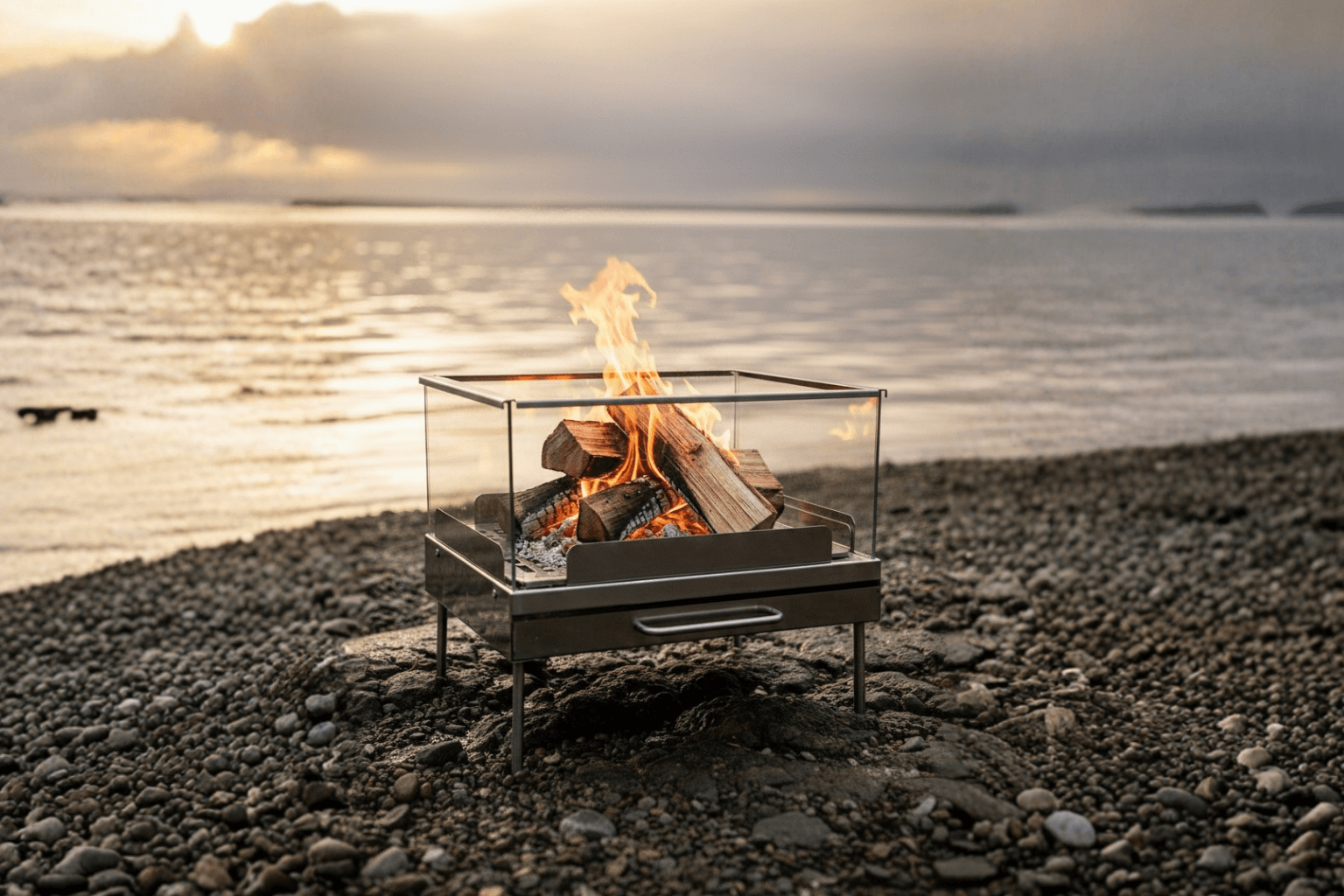 Designed for those looking for a stainless steel glass fire pit, the Stainless Steel Cube FireBox with Glass features glass protection on all four sides, providing a 360° view of the flames. Ideal for gardens, terraces, beaches, or outdoor settings, it creates a stylish atmosphere while offering a more controlled burning experience.